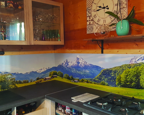 Crédence avec un décor de montagne. Photo choisie sur 123rf et adaptée au format de la crédence. Crédence sur mesure installée à Hugleville en caux en Seine maritime 76..