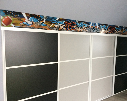 Panneau mural en aluminium réalisé et imprimé selon les critères du client. Cette frise est installée dans une salle de jeux d'enfants dans l'Eure 27.